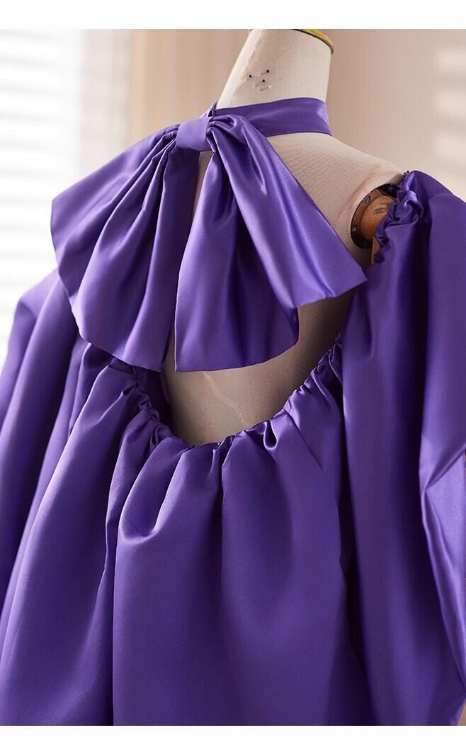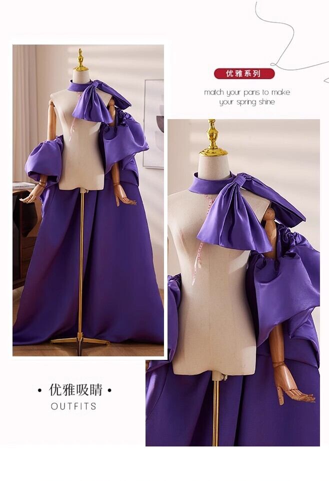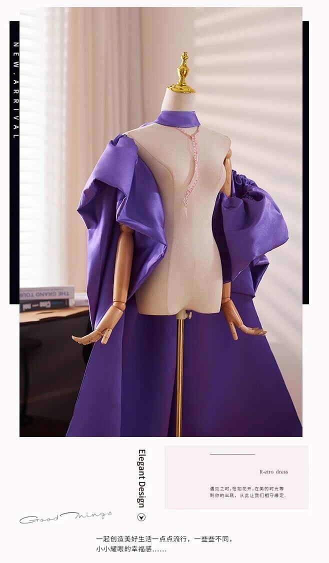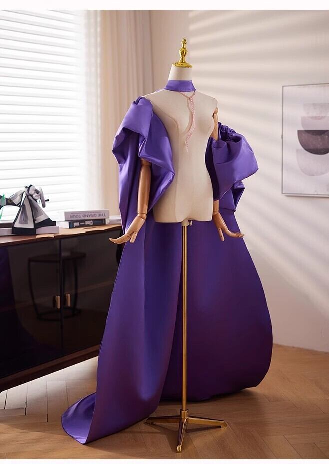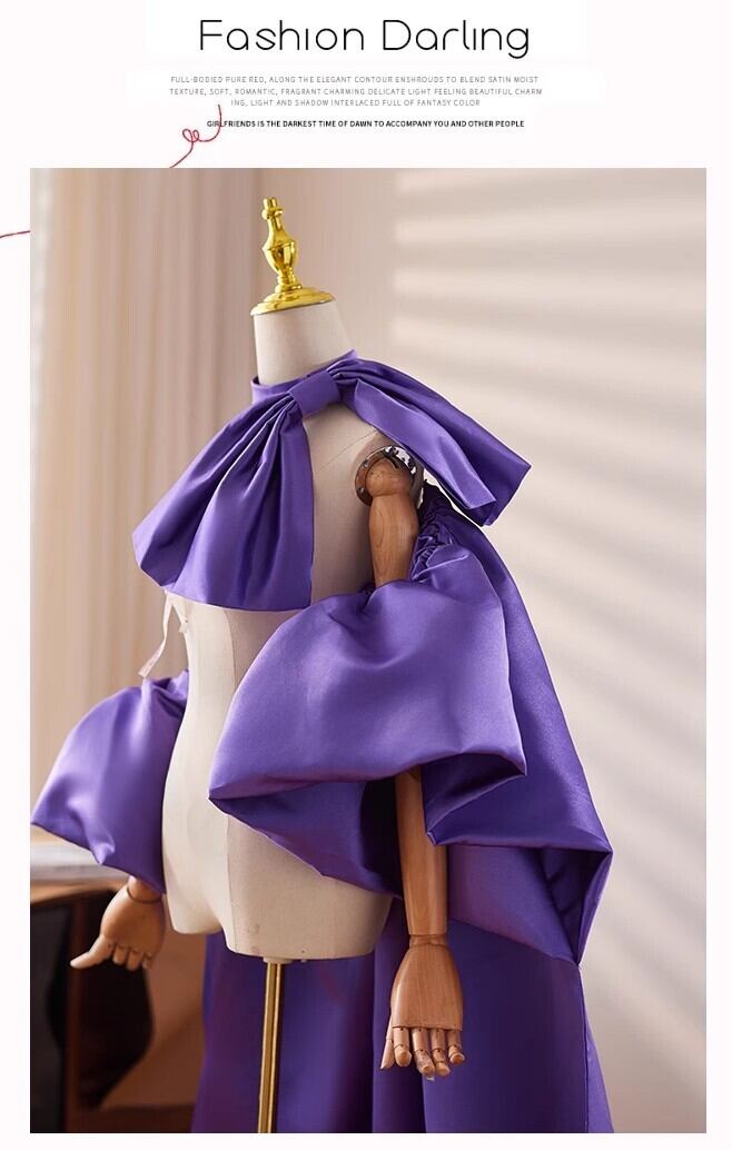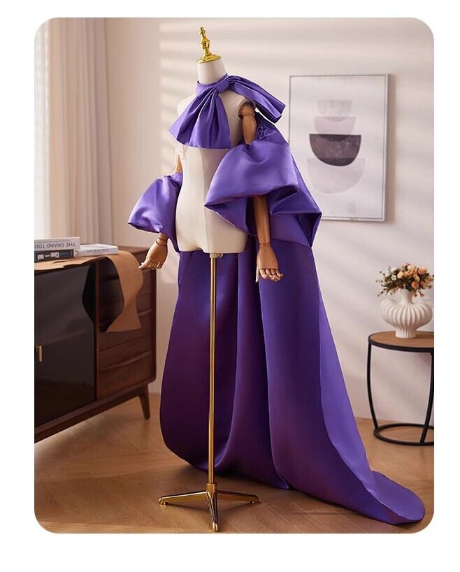 高品質! 紫 光沢サテン ポンチョ ウエディングドレス 華やかなトレーン 2次会 前撮り 花嫁 挙式