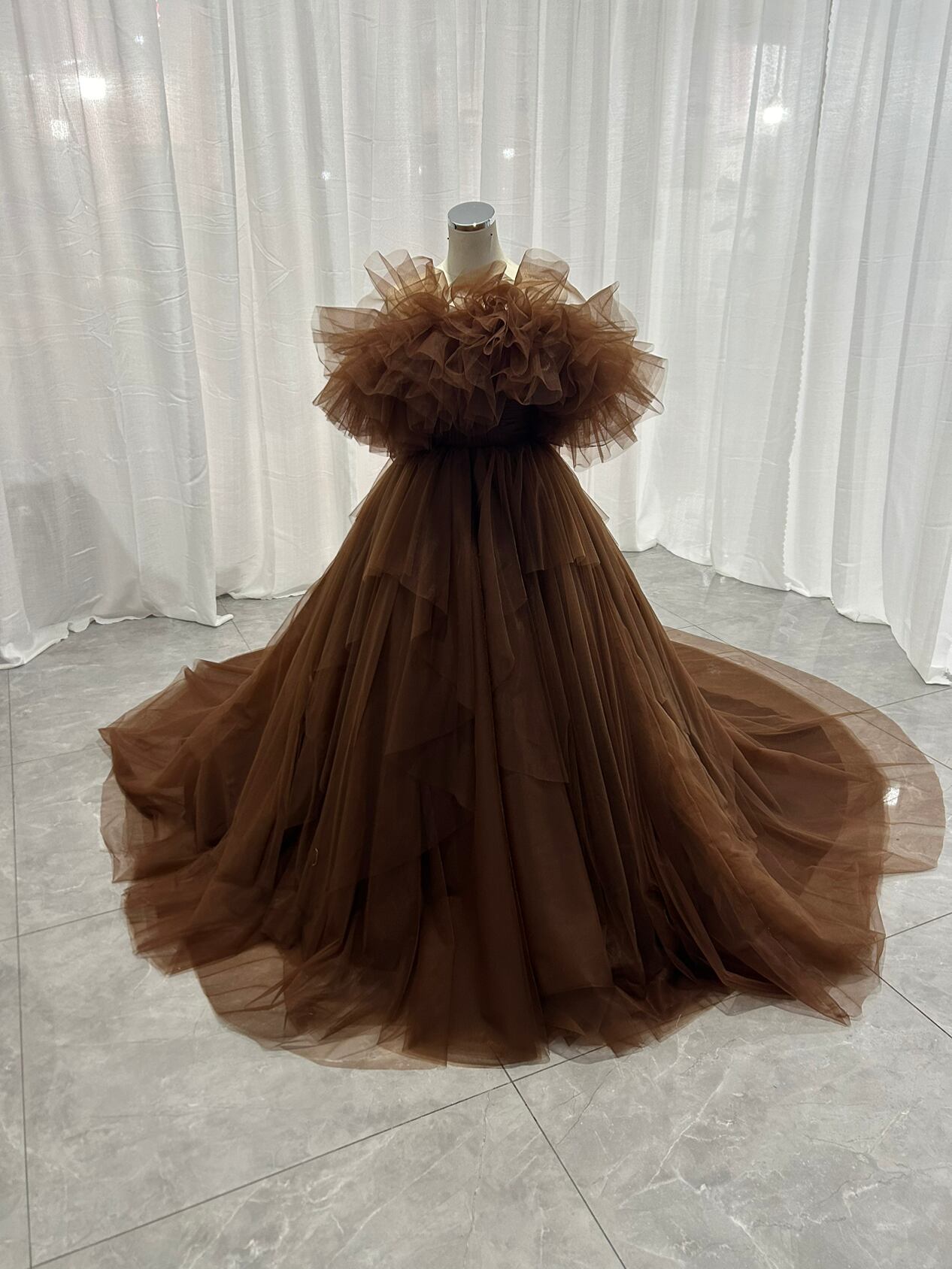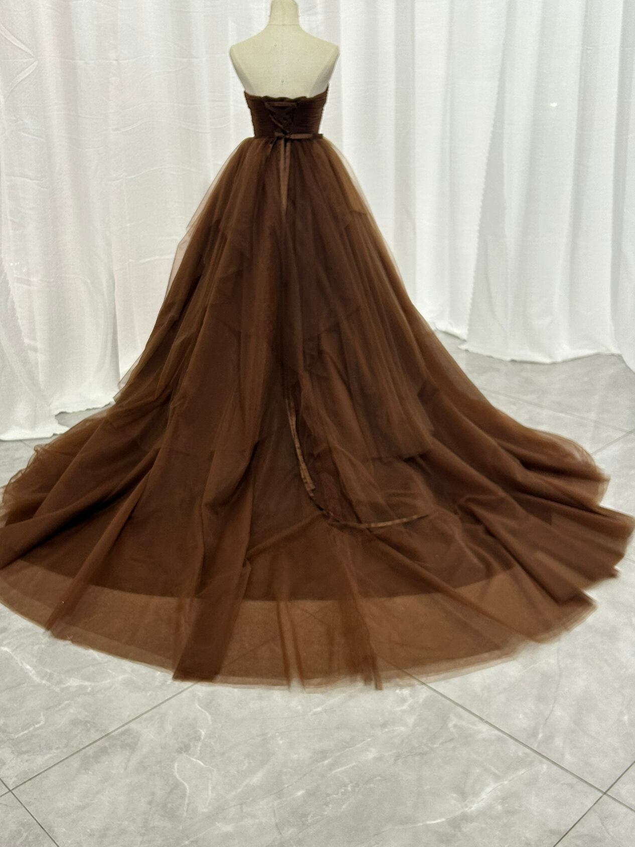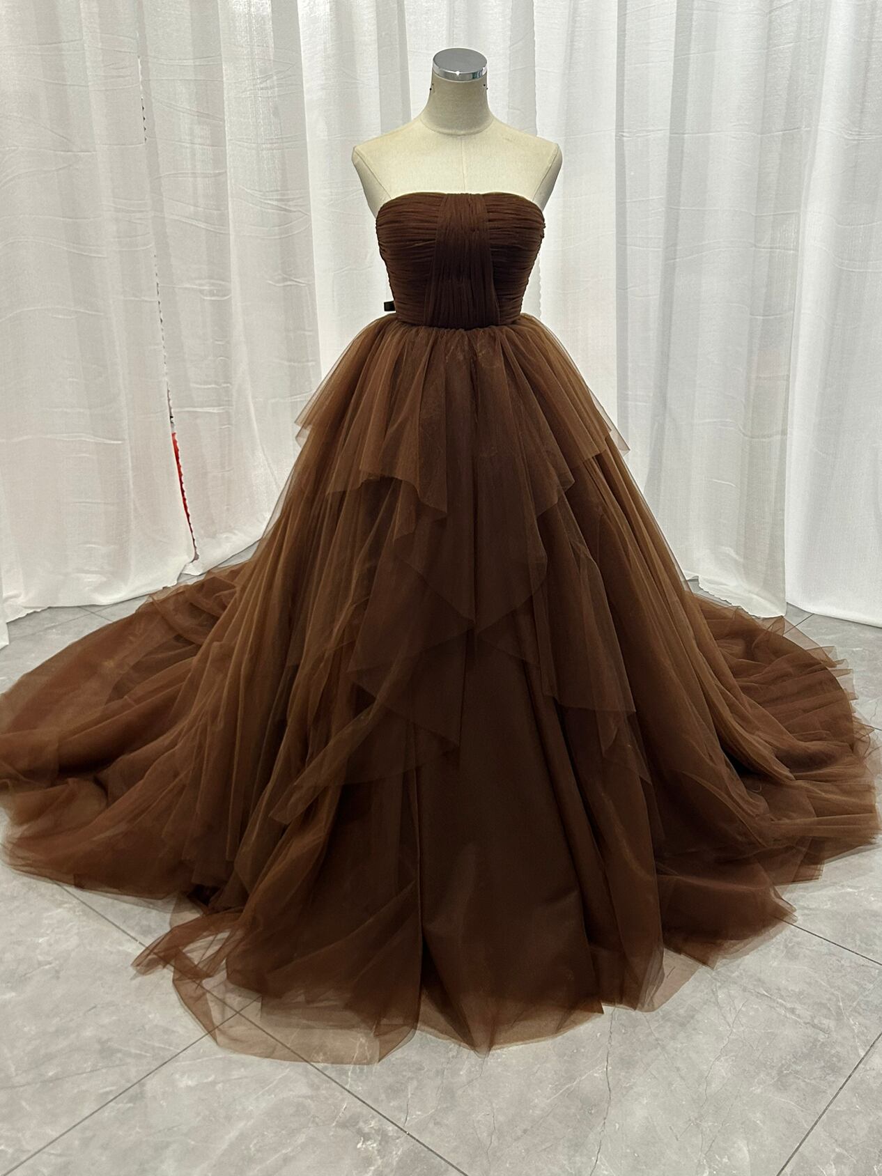 輝きな光彩を放つ 薄 コーヒーの色 取り外しオフショルダーリッターチ カラードレス 華やかなトレーン プリン