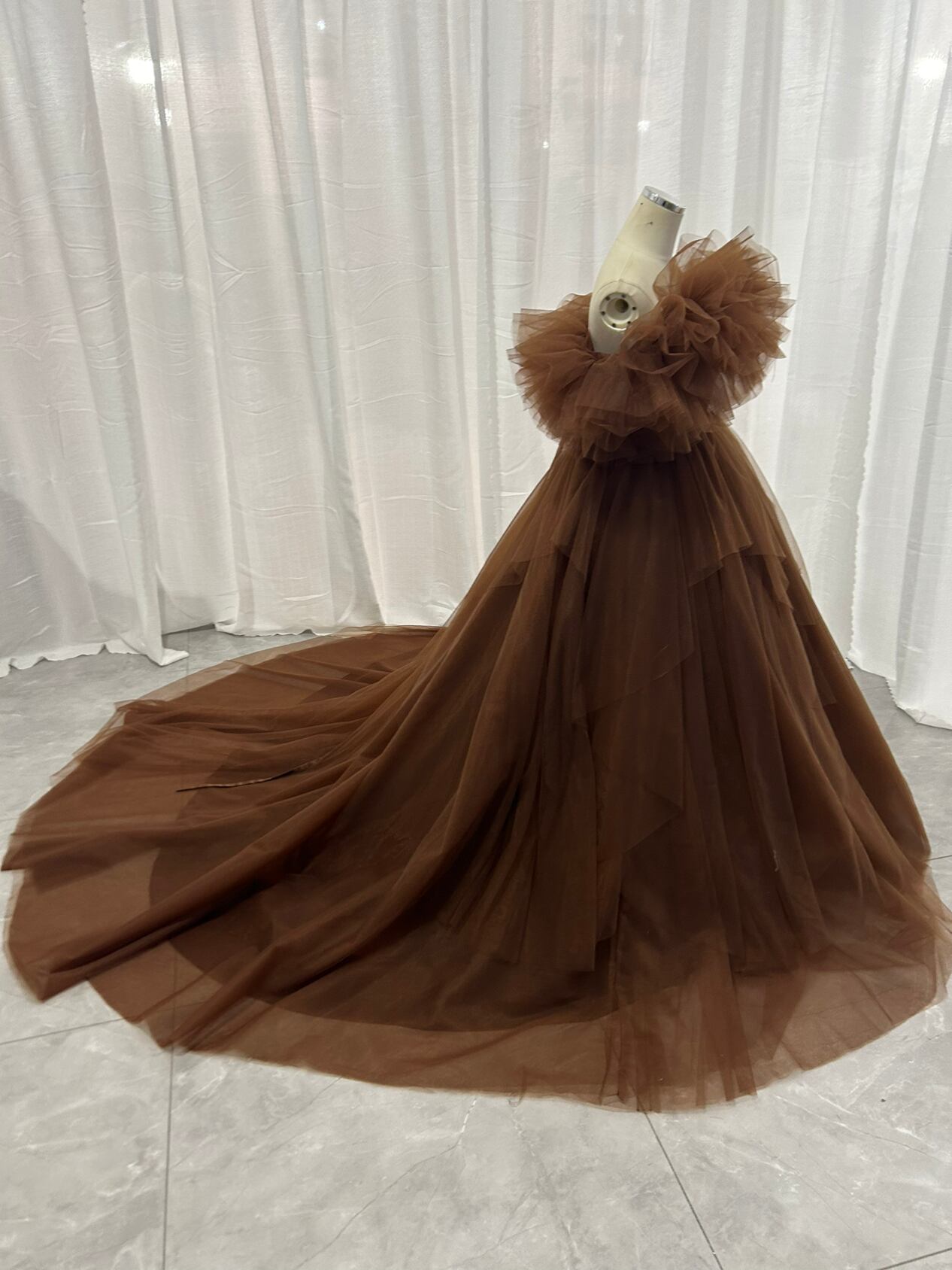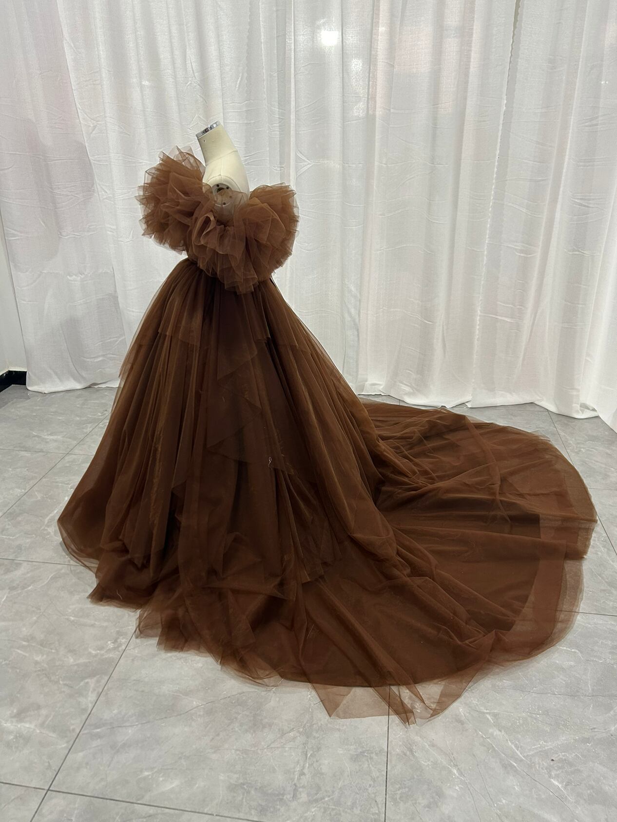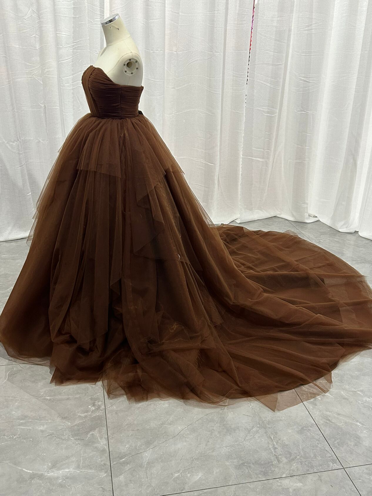 輝きな光彩を放つ 薄 コーヒーの色 取り外しオフショルダーリッターチ カラードレス 華やかなトレーン プリン