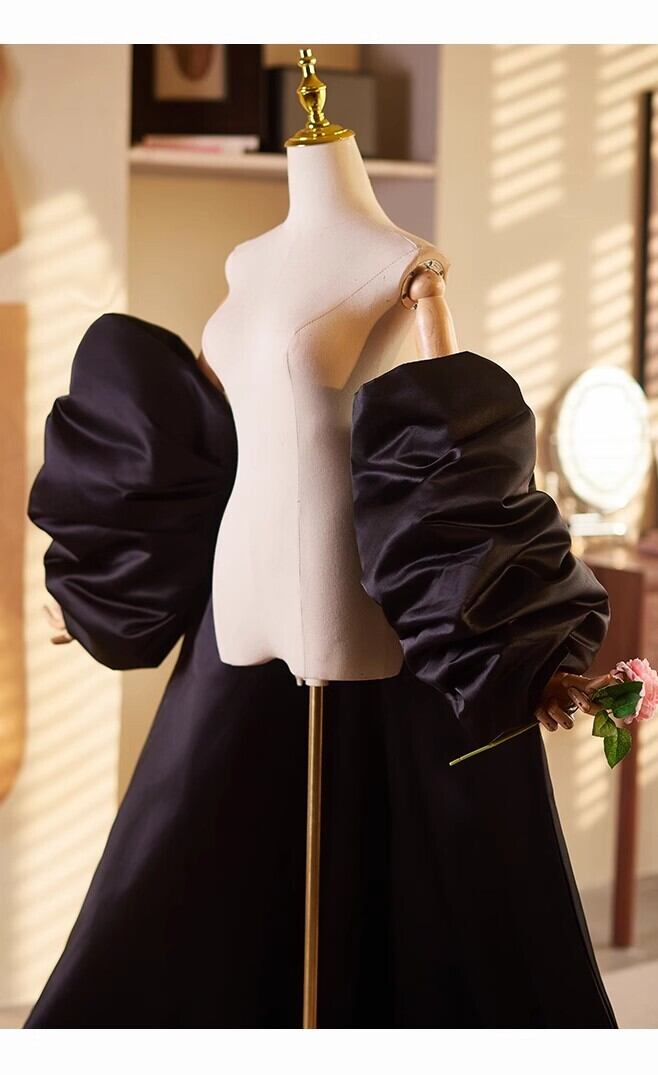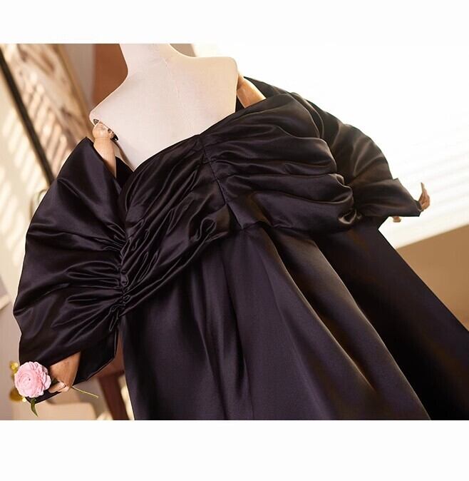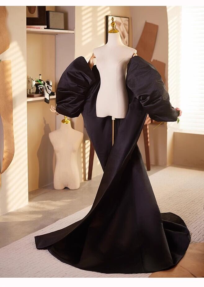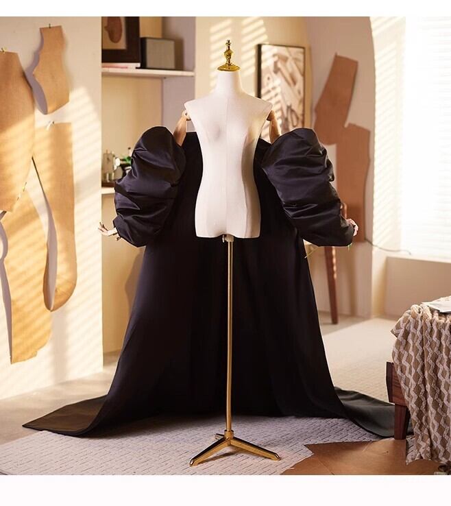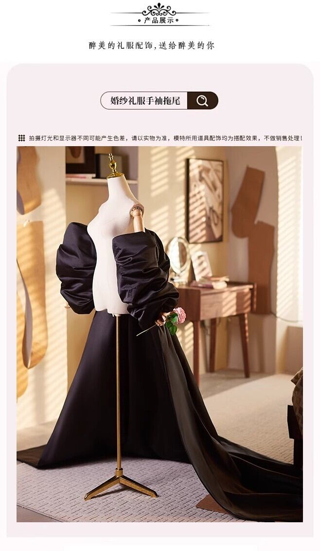 高品質!黒 豪華 袖 光沢サテン ポンチョ ウエディングドレス 華やかなトレーン 2次会 前撮り 花嫁 挙式