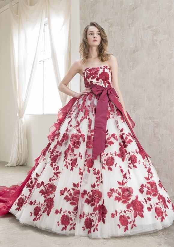 上品!取り外しフリルトレーン ワインレッド カラードレス ウエストリボン 花柄 パーティードレス イブニングドレス 演奏ドレス