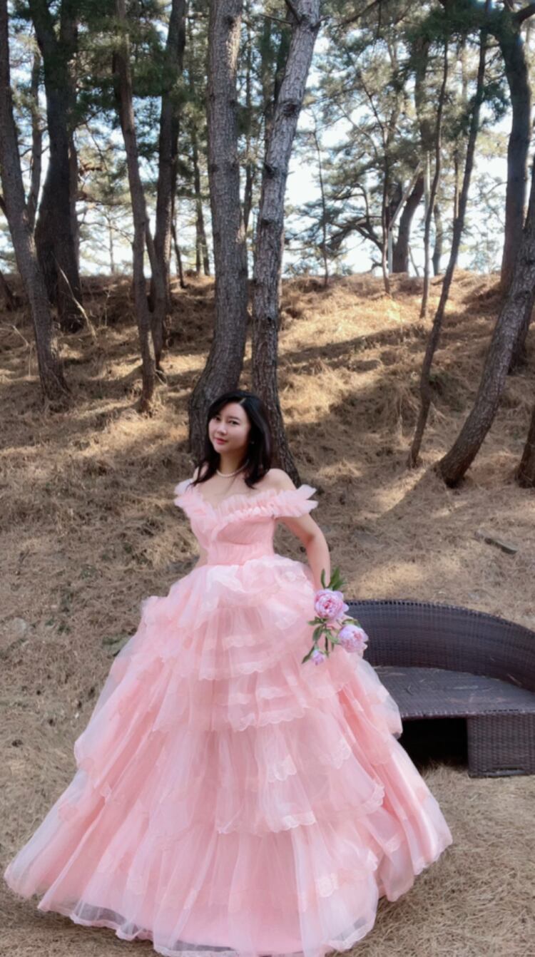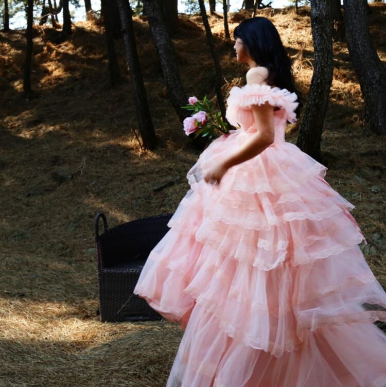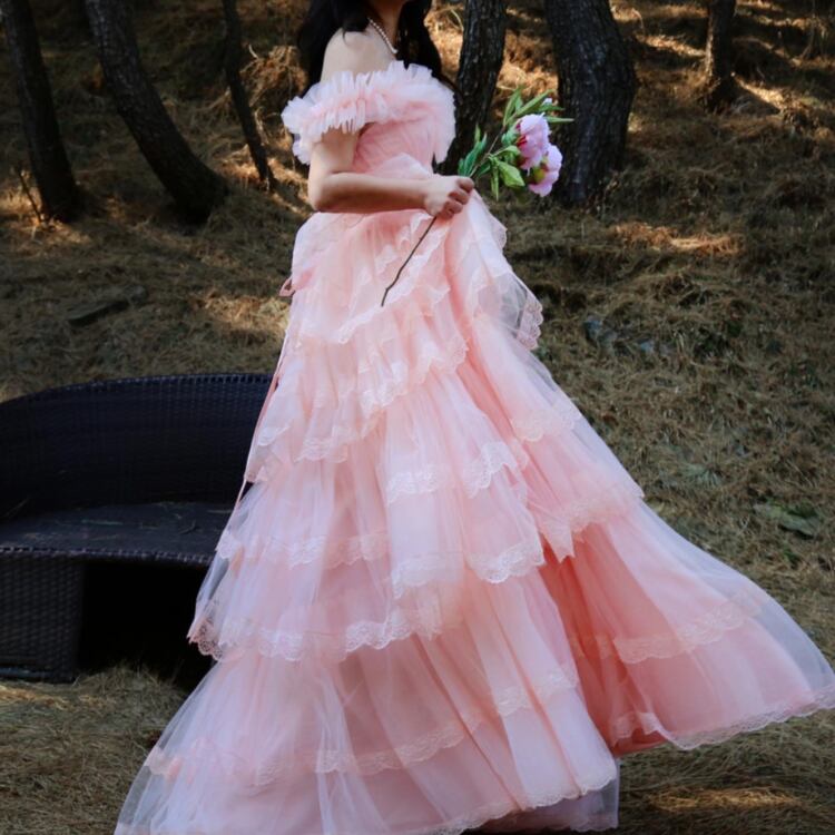 上品!薄ピンク カラードレス ティアードドレス オフショルダー チュールドレス 繊細レース ミディアムドレス パーティードレス【色変更可能】