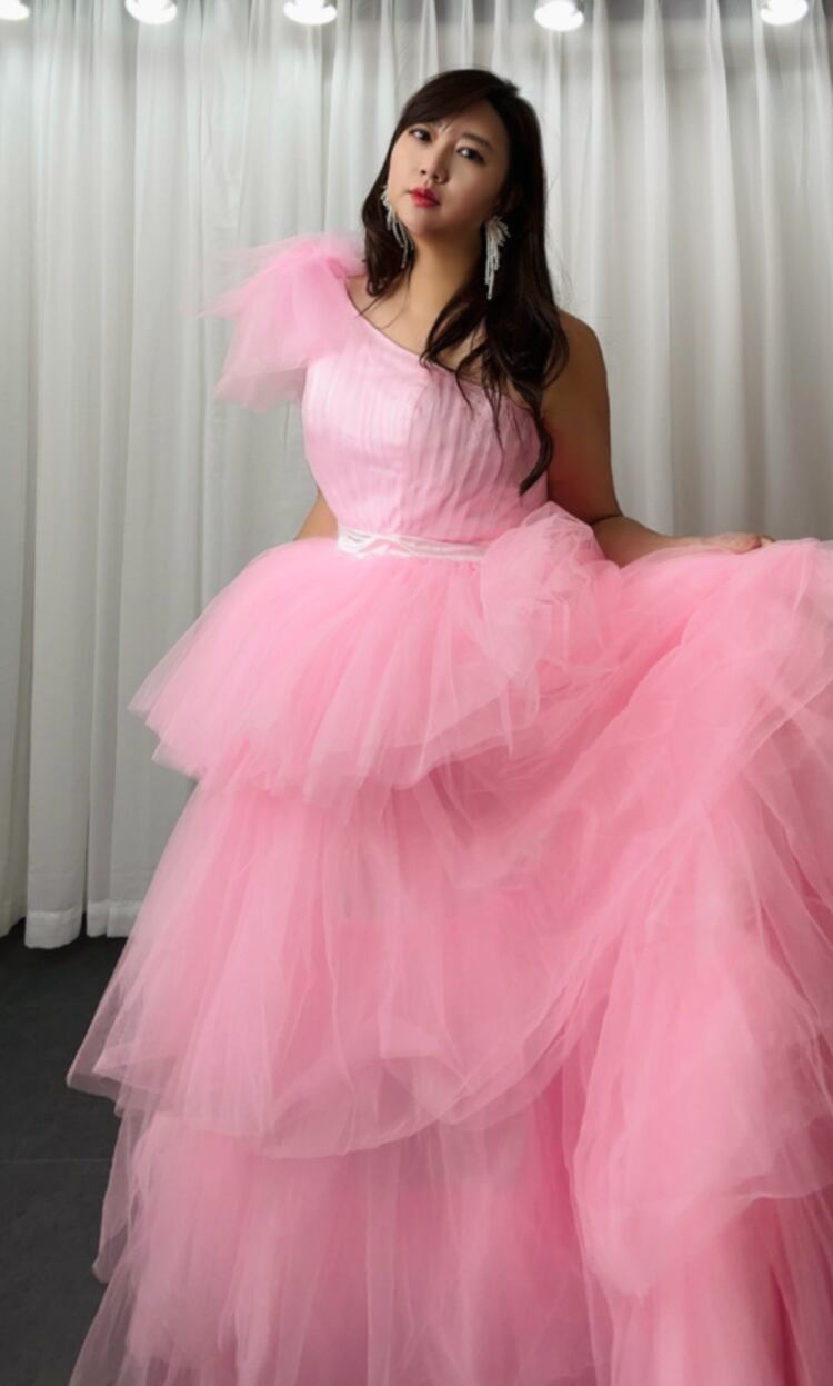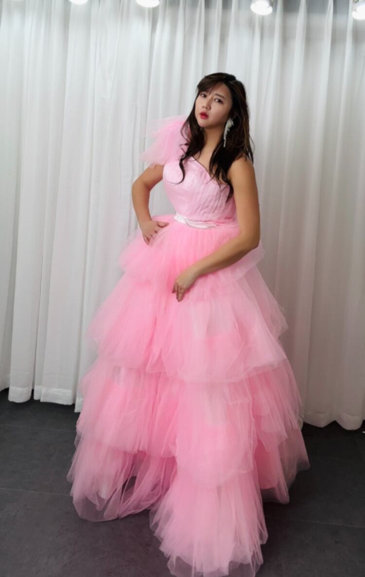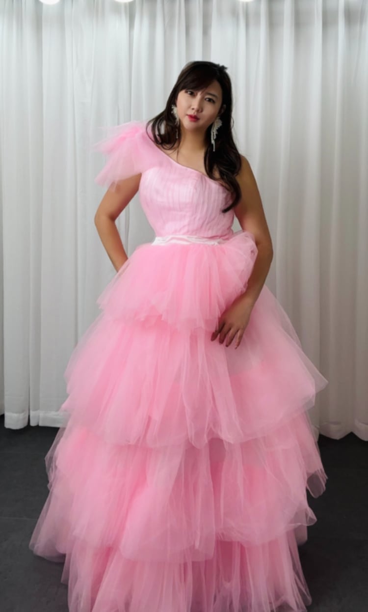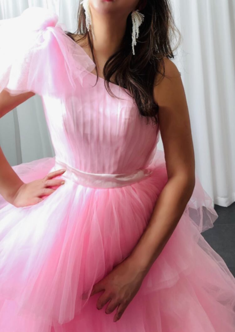 上品!ピンク カラードレス ティアードドレス ワンショルダー ふわふわチュールドレス イブニングドレス 演奏会 パーティードレス【色変更可能】
