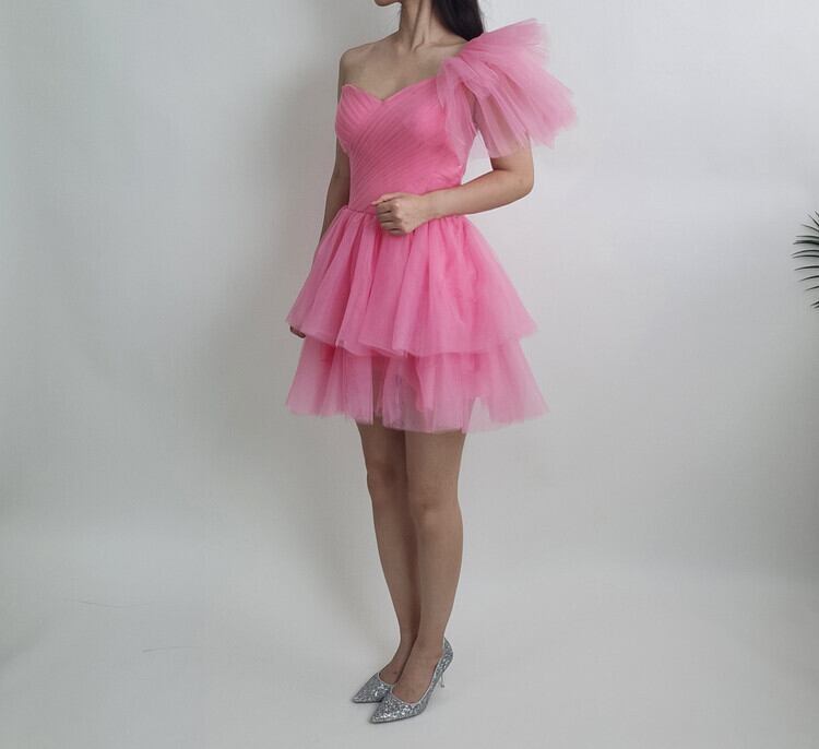 上品!ピンク カラードレス ティアードドレス ワンショルダー ミニドレス ダンスドレス イブニングドレス 演奏会 パーティードレス【色変更可能】