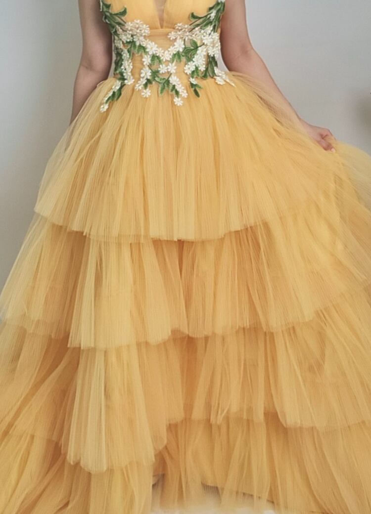 美品!イエロー/黄色 カラードレス ティアードドレス 鮮やかな刺繡 プリーツドレス チュールドレス ベアトップ ミディアムドレス パーティードレス【色変更可能】