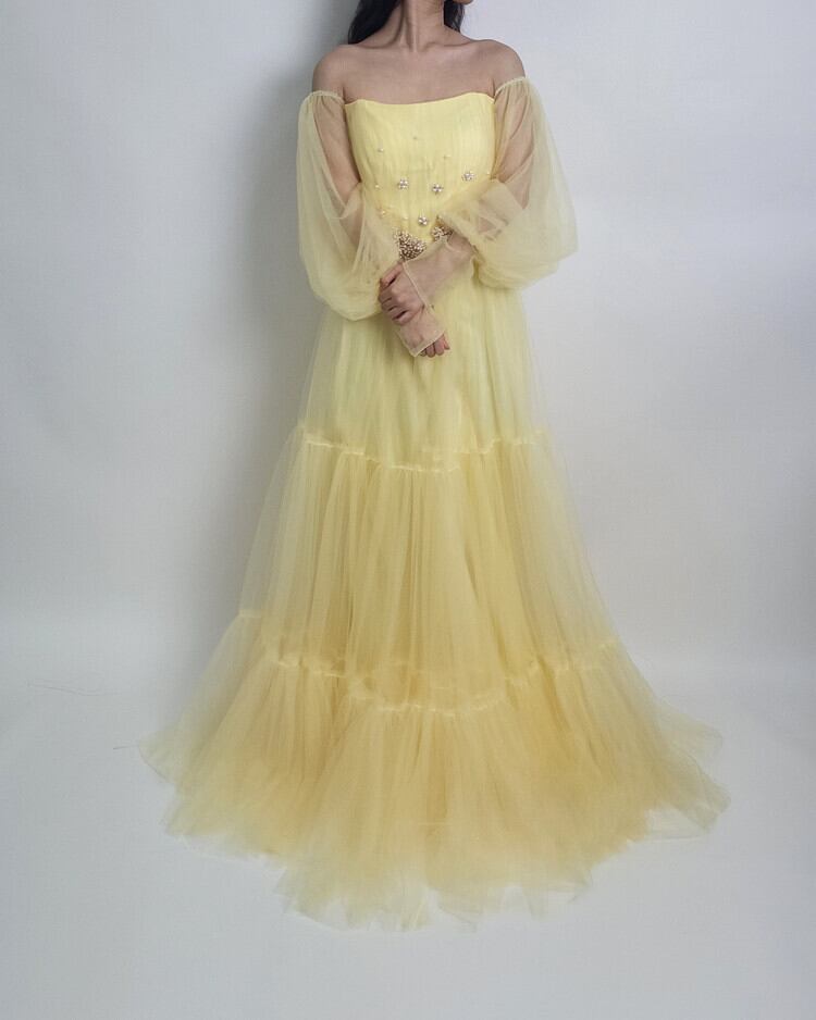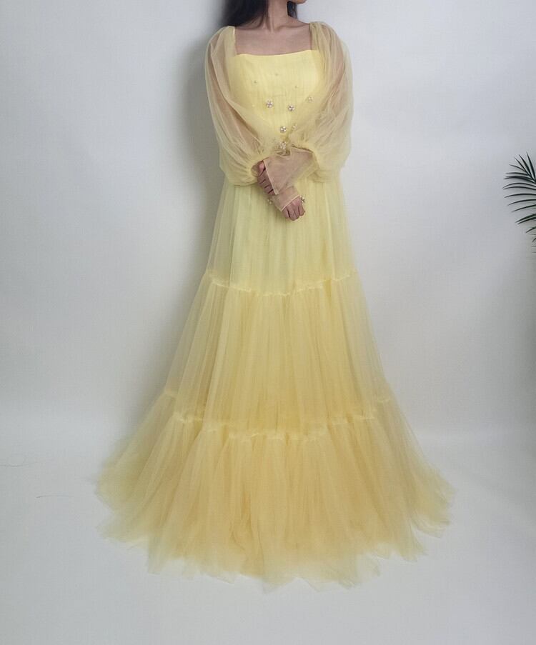 美品!イエロー/黄色 カラードレス ロングスリーブ 付け袖 ビーディング チュールドレス イブニングドレス パーティードレス【色変更可能】