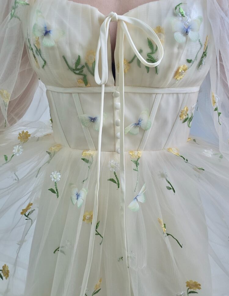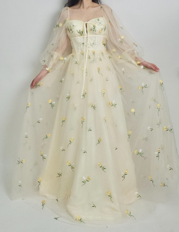 美品!パステルイエロー/黄色 カラードレス ロングスリーブ 刺繡レース チュールドレス イブニングドレス パーティードレス【色変更可能】