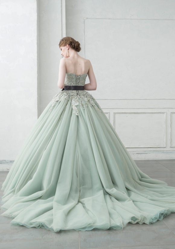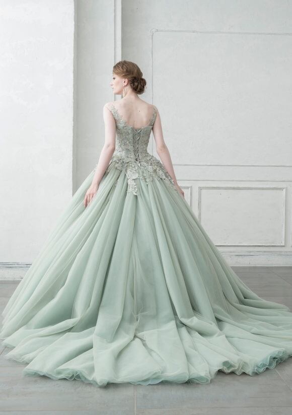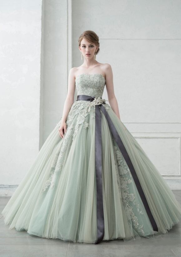 上品!薄グリーン カラードレス ウエストリボン 繊細レース チュールドレス ミディアムドレス パーティードレス【色変更可能】
