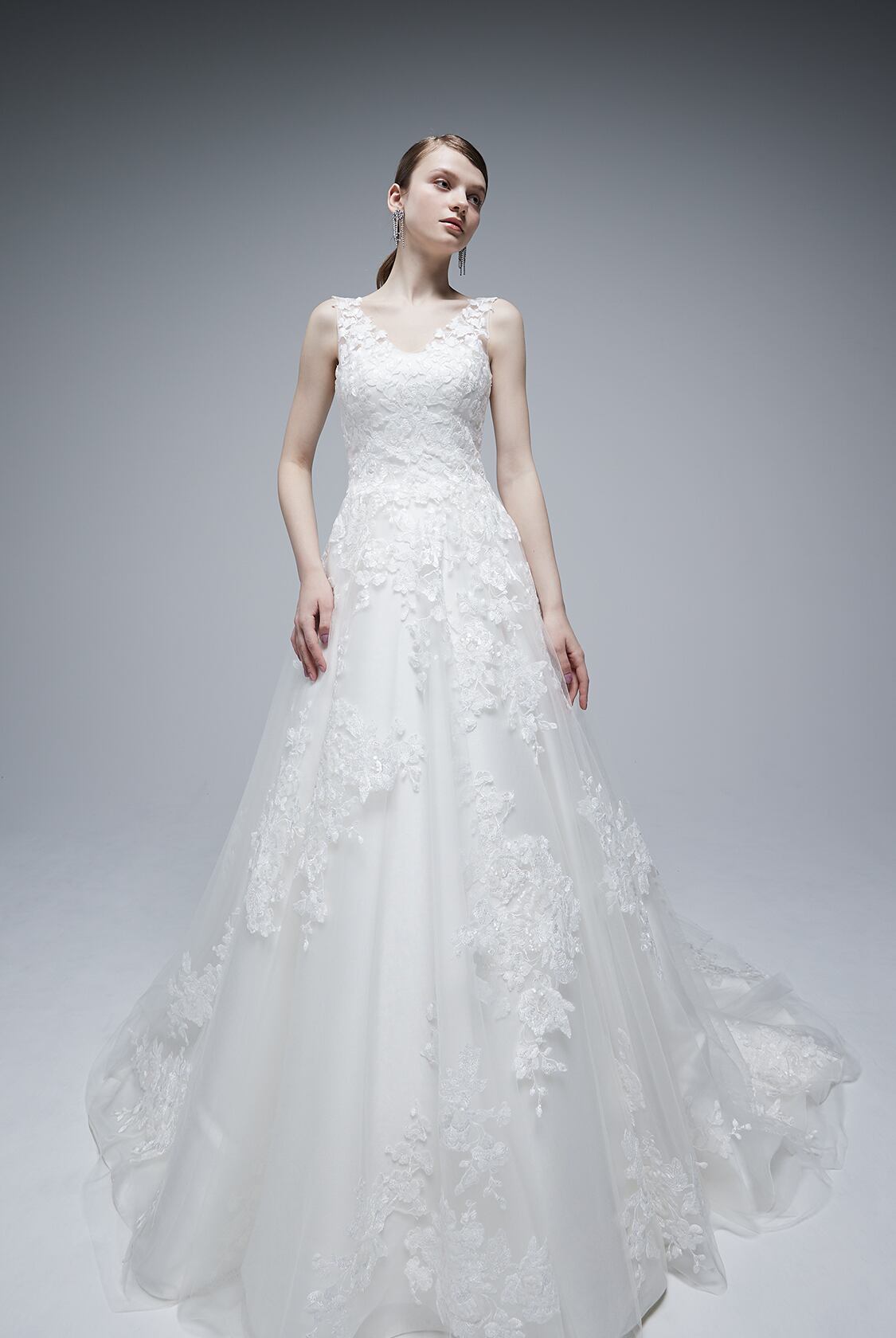 美品!ウエディングドレス 繊細レースアップリケ 花モチーフ刺繍 ノースリーブ Aラインドレス 結婚式/前撮り【オーダーメイド】
