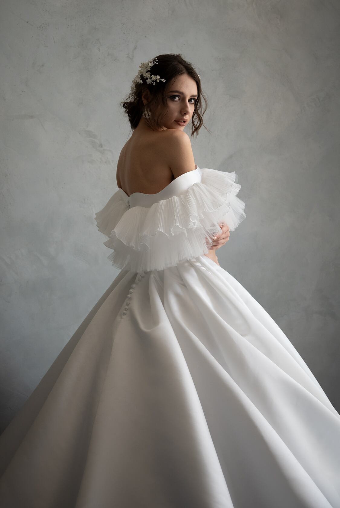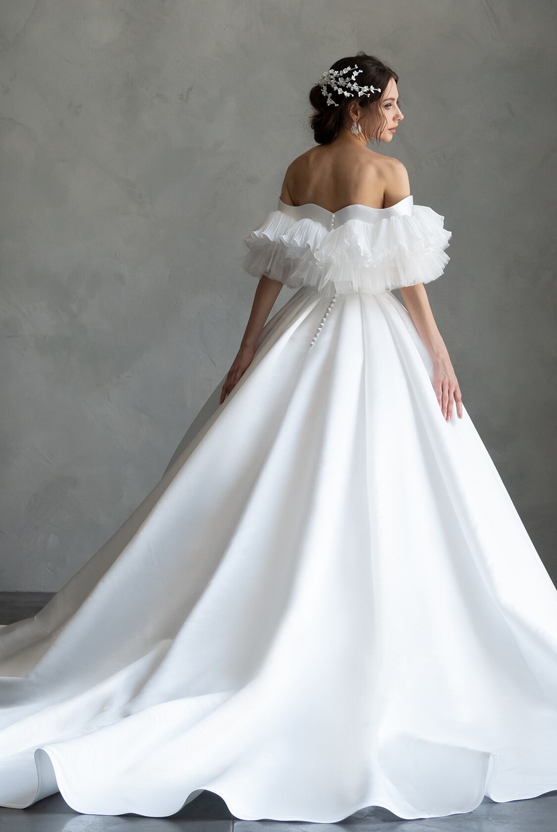 美品!ウエディングドレス プリーツオフショルダー サテンドレス フェミニン Aラインドレス 結婚式/前撮り【オーダーメイド】