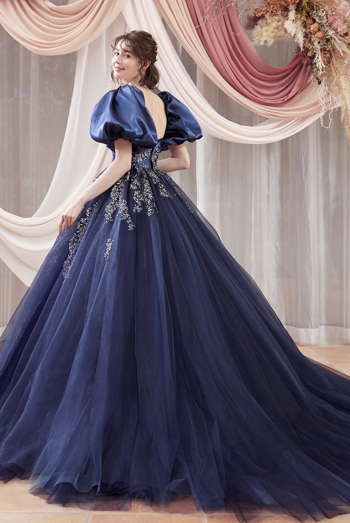 上品!ネイビーブルー 取り外しパフスリーブ カラードレス レースアップリケ ミディアムドレス パーティードレス【色変更可能】