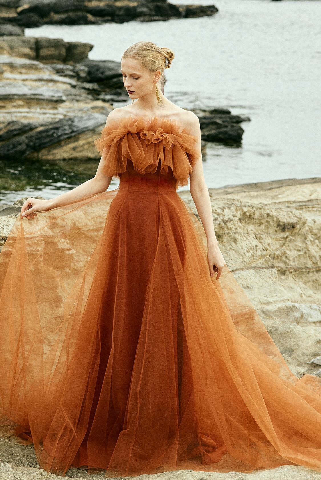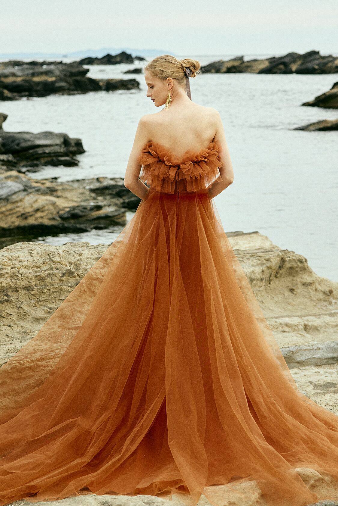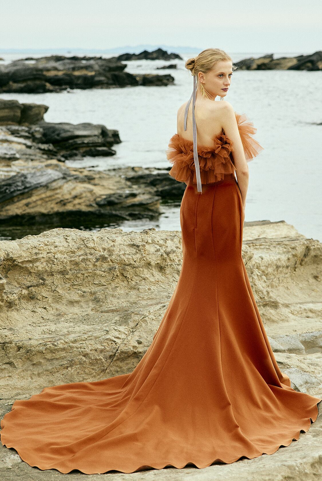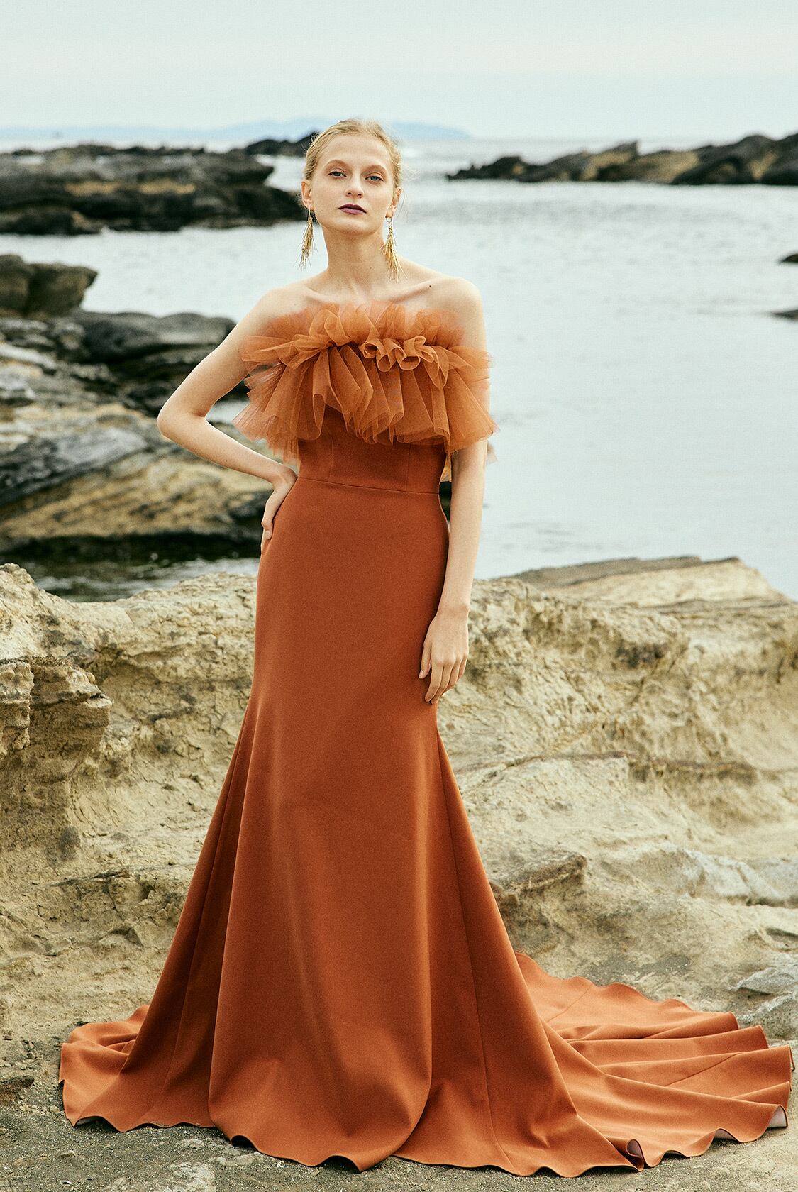 美品!テラコッタ色 カラードレス ラッフルフリル ソフトマーメイド 美しいボディライン フェミニン 結婚式/前撮り【色変更可能】