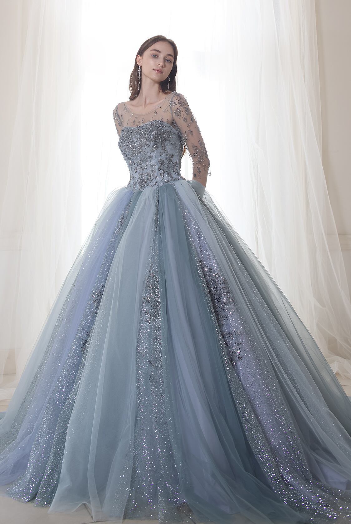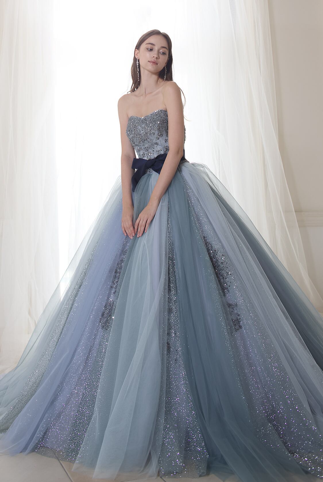 美品!くすんだブルー チュールトップス キラキラカラードレス グラデーション ウエストリボン ラメチュール フェミニン 結婚式/前撮り【色変更可能】
