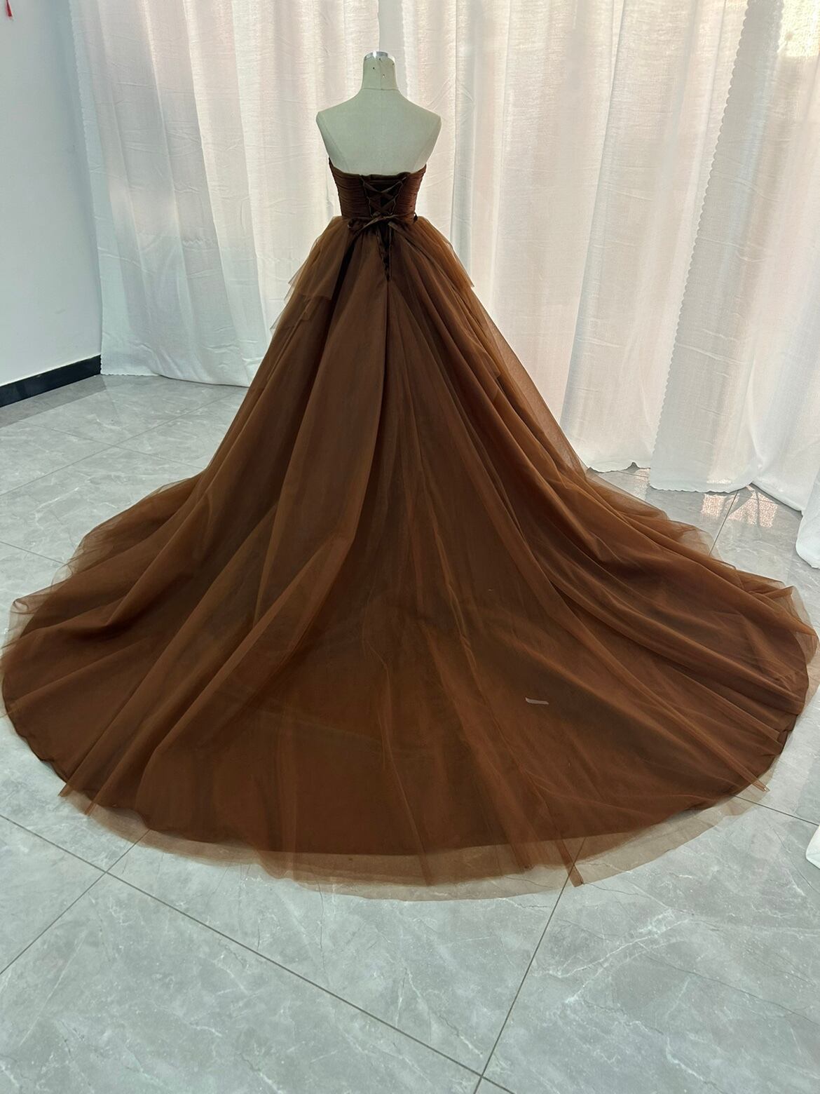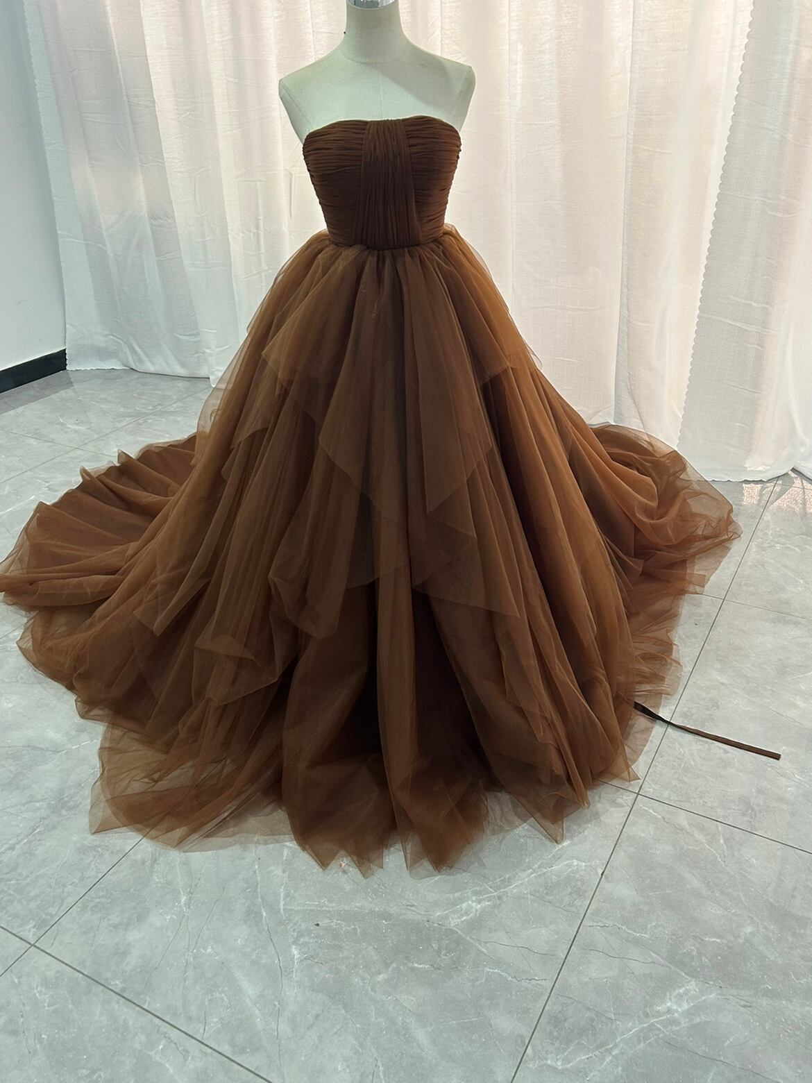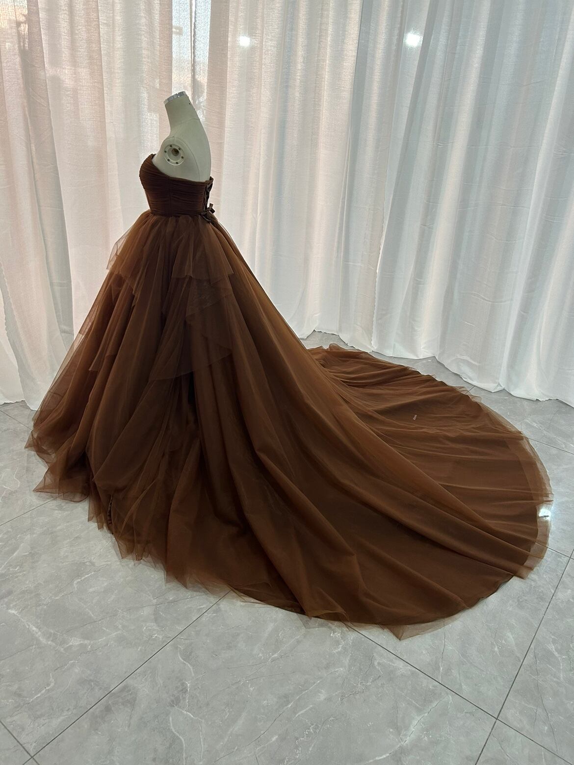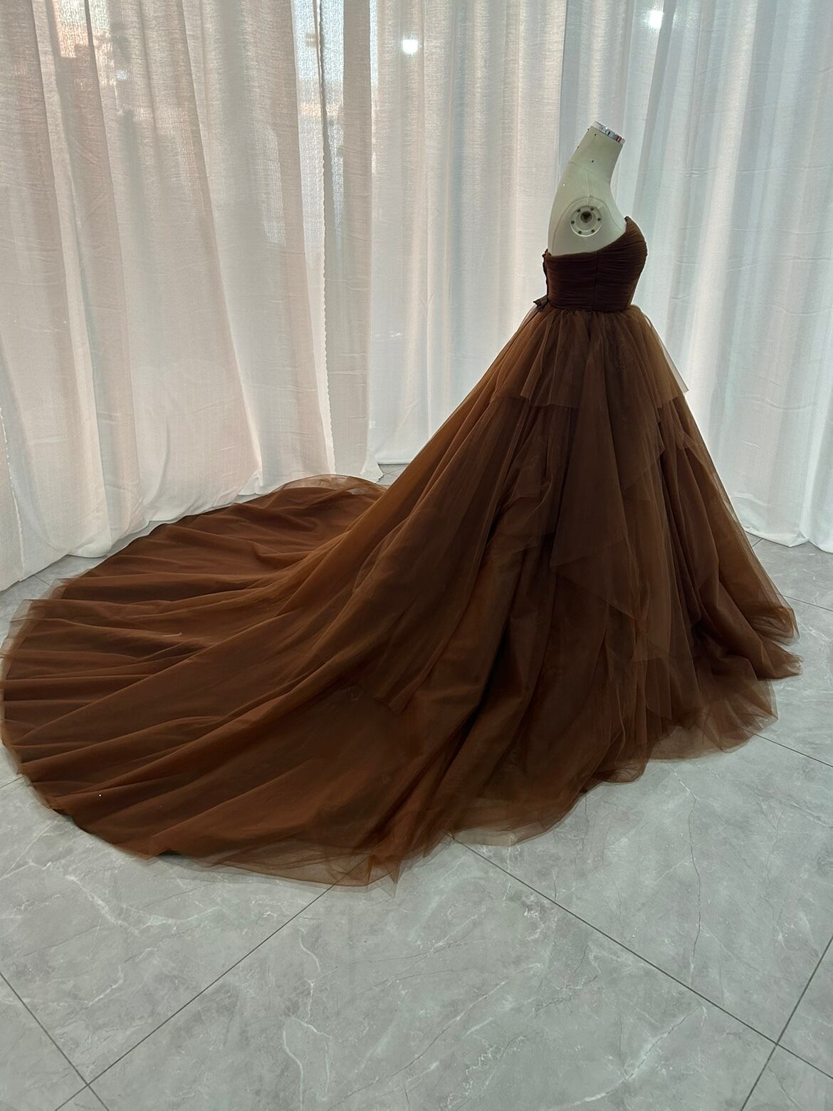 輝きな光彩を放つ 薄 コーヒーの色 カラードレス 華やかなトレーン プリン