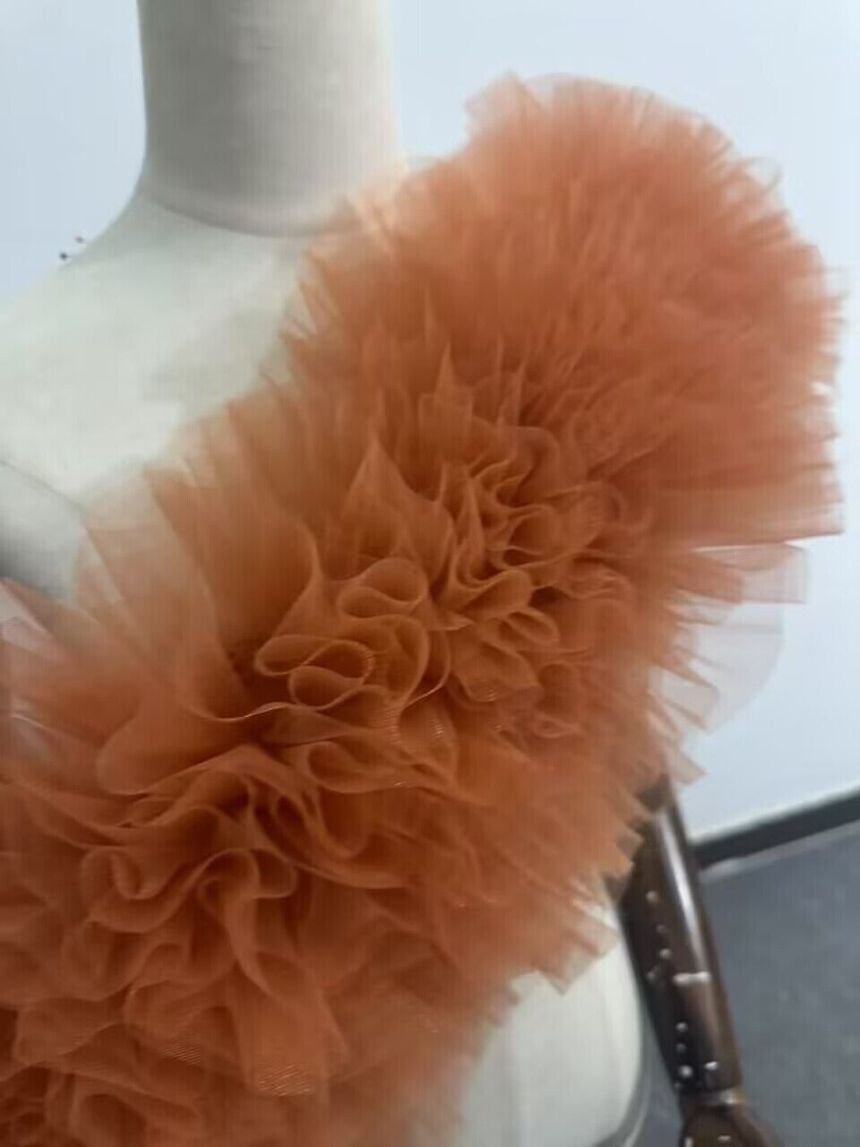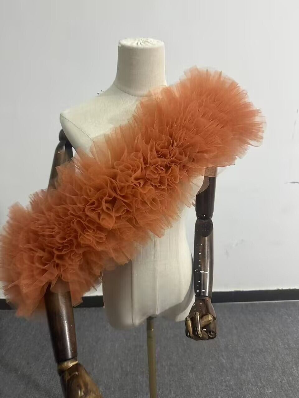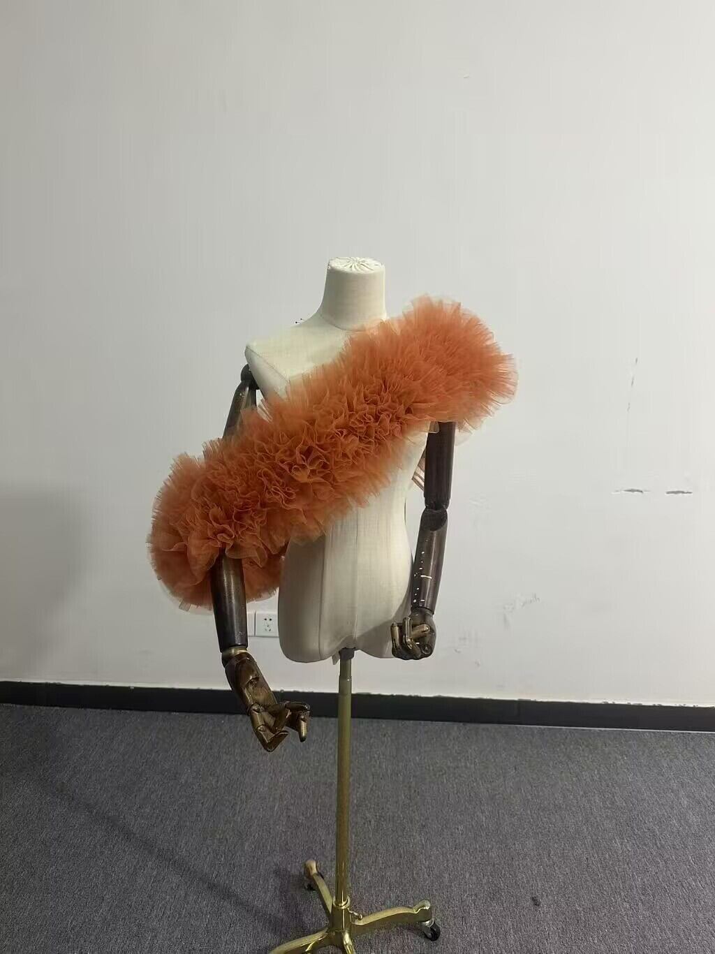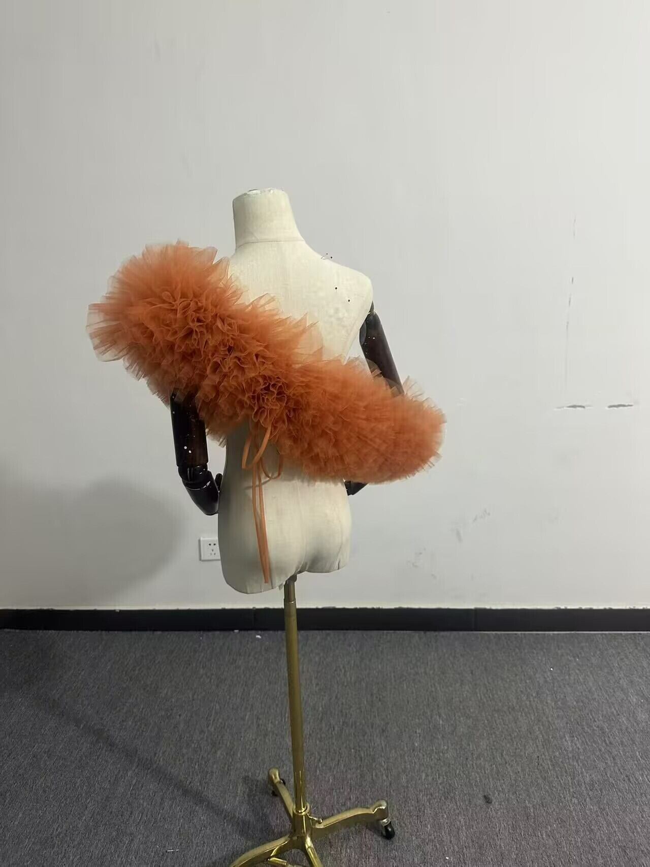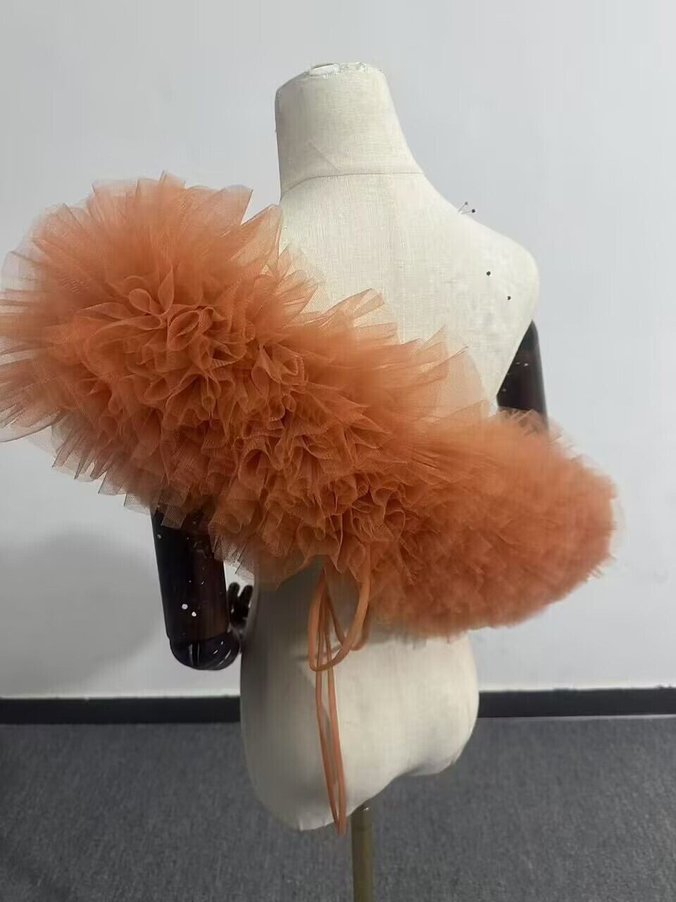 ウエディングドレス テラコッタ色 オフショルダー お色直し サイズ調整可能 ふわふわ襟 二の腕カバー カラードレス