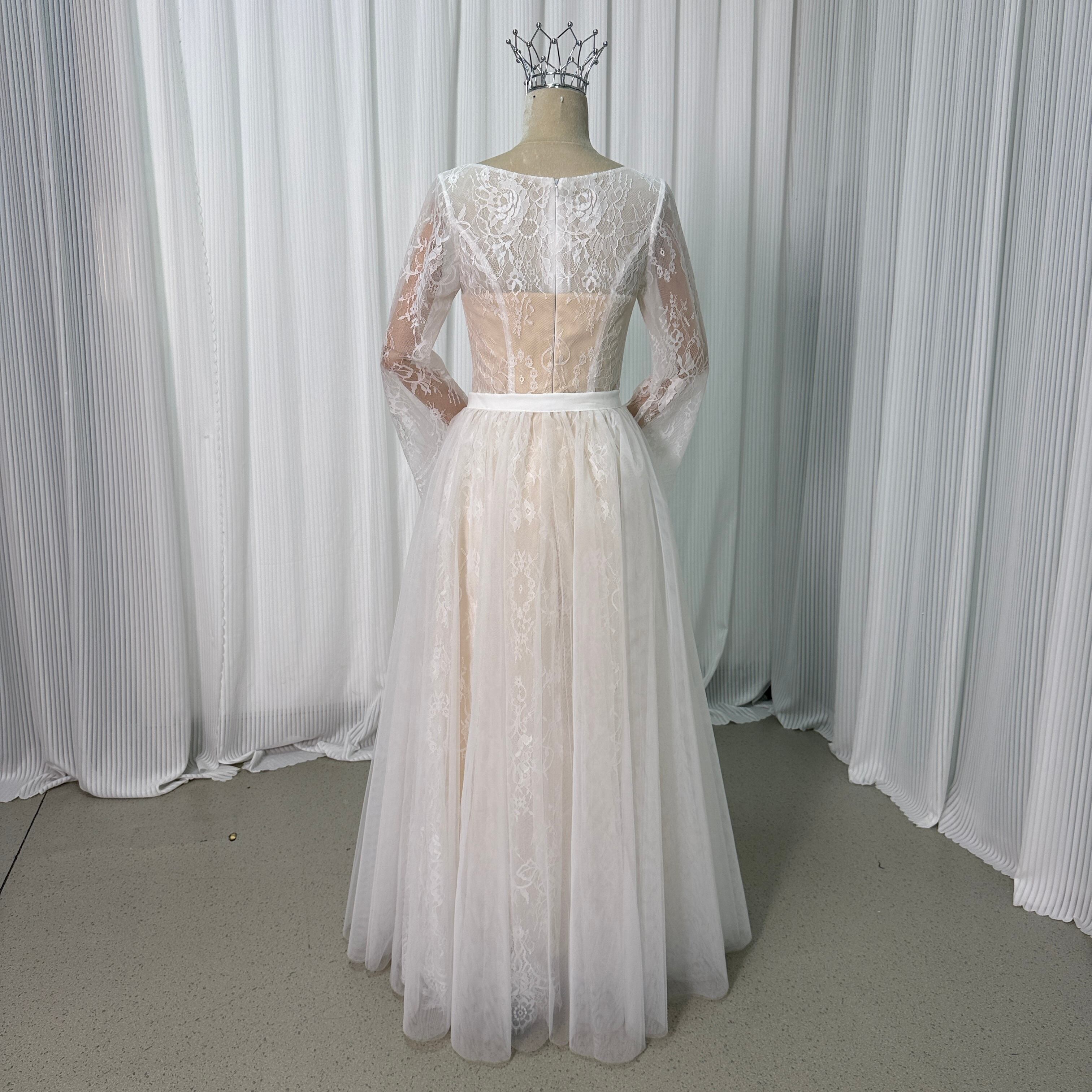 美品!立体レース刺繍 長袖 ウエディングドレス チュールドレス + オーバースカート結婚式/前撮り【オーダーメイド】