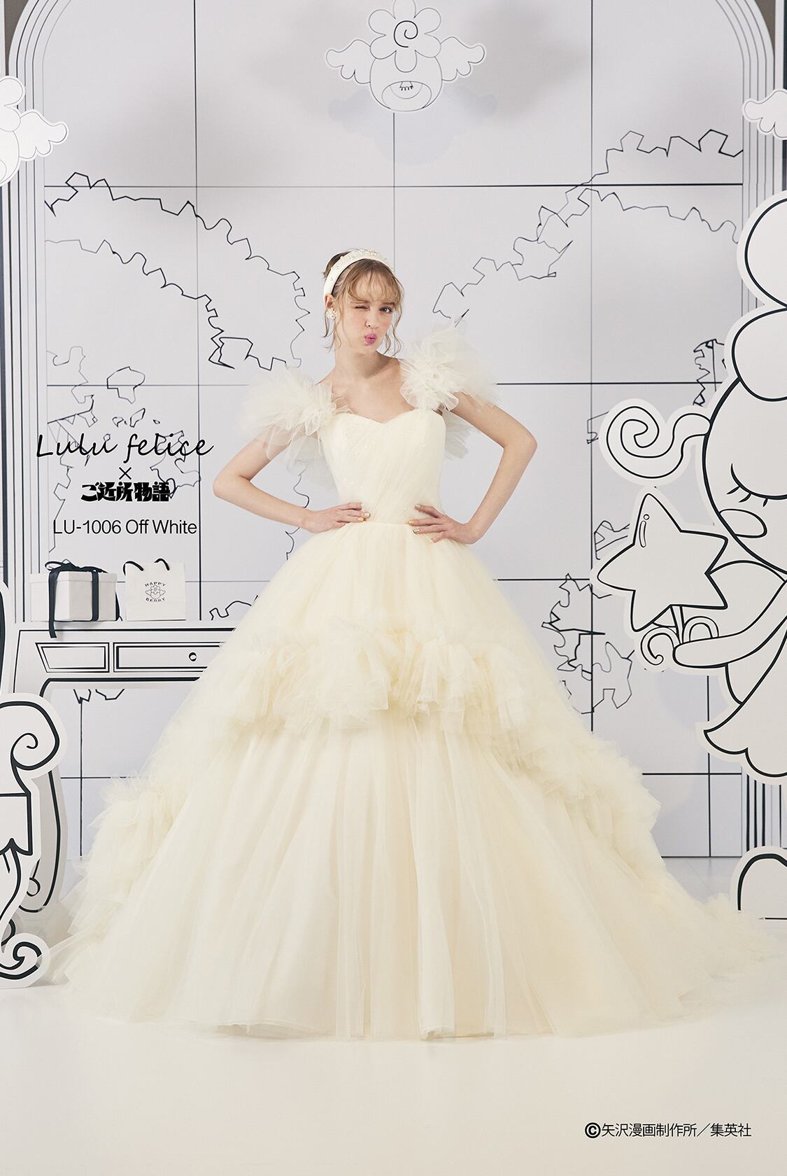 美品!ウエディングドレス クリームホワイト カラードレス ふわふわスリーブ もふもふ裾 ボリュームドレス フェミニン イブニングドレス【色変更可能】