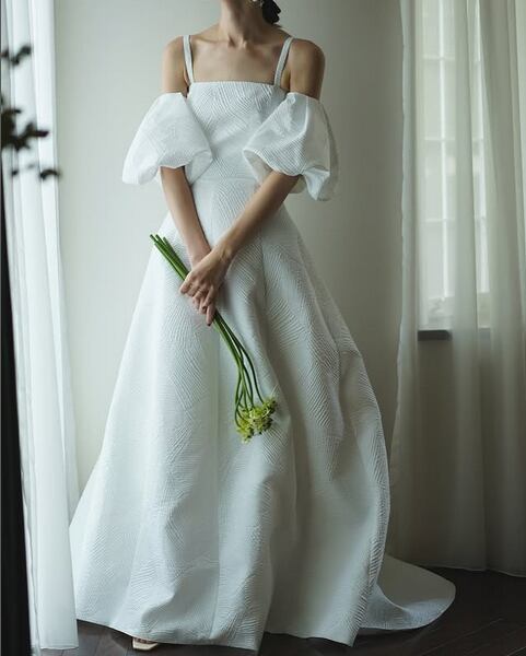 美品!ウエディングドレス パフスリーブ キャミソール ジャカード生地 Aラインドレス パーティードレス フェミニン【オーダーメイド】