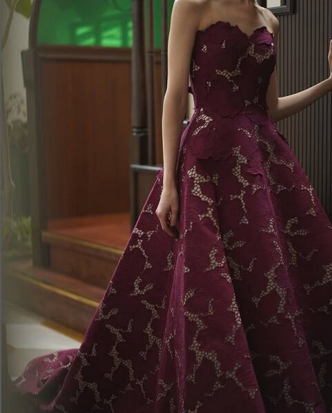 美品!ボルドー色 カラードレス Aラインドレス 総レースドレス ベアトップビスチェ パーティードレス フェミニン【色変更可能】