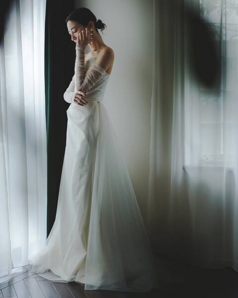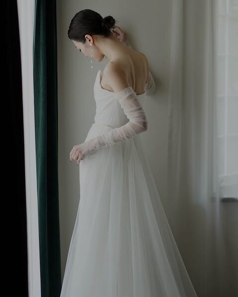 美品!ウエディングドレス ソフトチュール マーメイドライン ビスチェスタイル 美しいボディーライン 取り外しスリーブ 細見えシルエット フェミニン【色変更可能】 | David1021k Dress(ダヴィドレス)